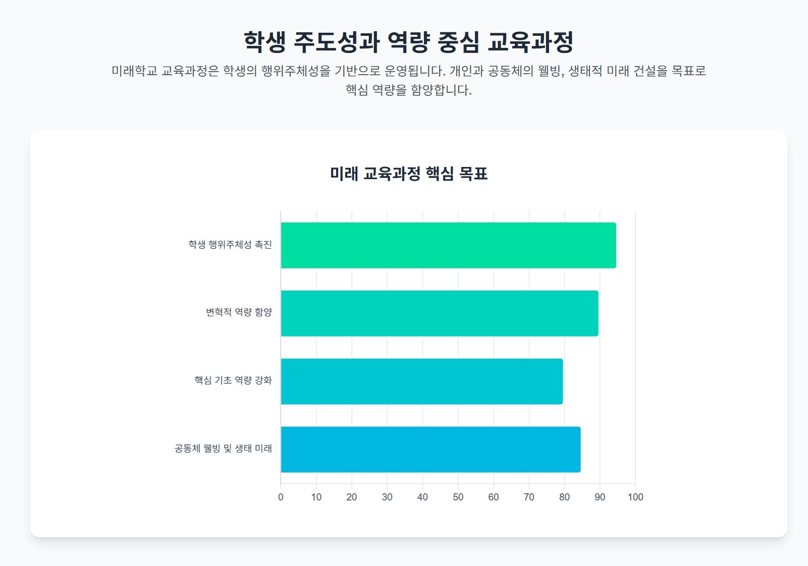 미래학교 교육과정은 개인과 공동체의 웰빙 및 생태적 미래 건설을 목표로, 변혁적 역량과 핵심 기초 역량 함양에 중점을 둔다 [User Query].