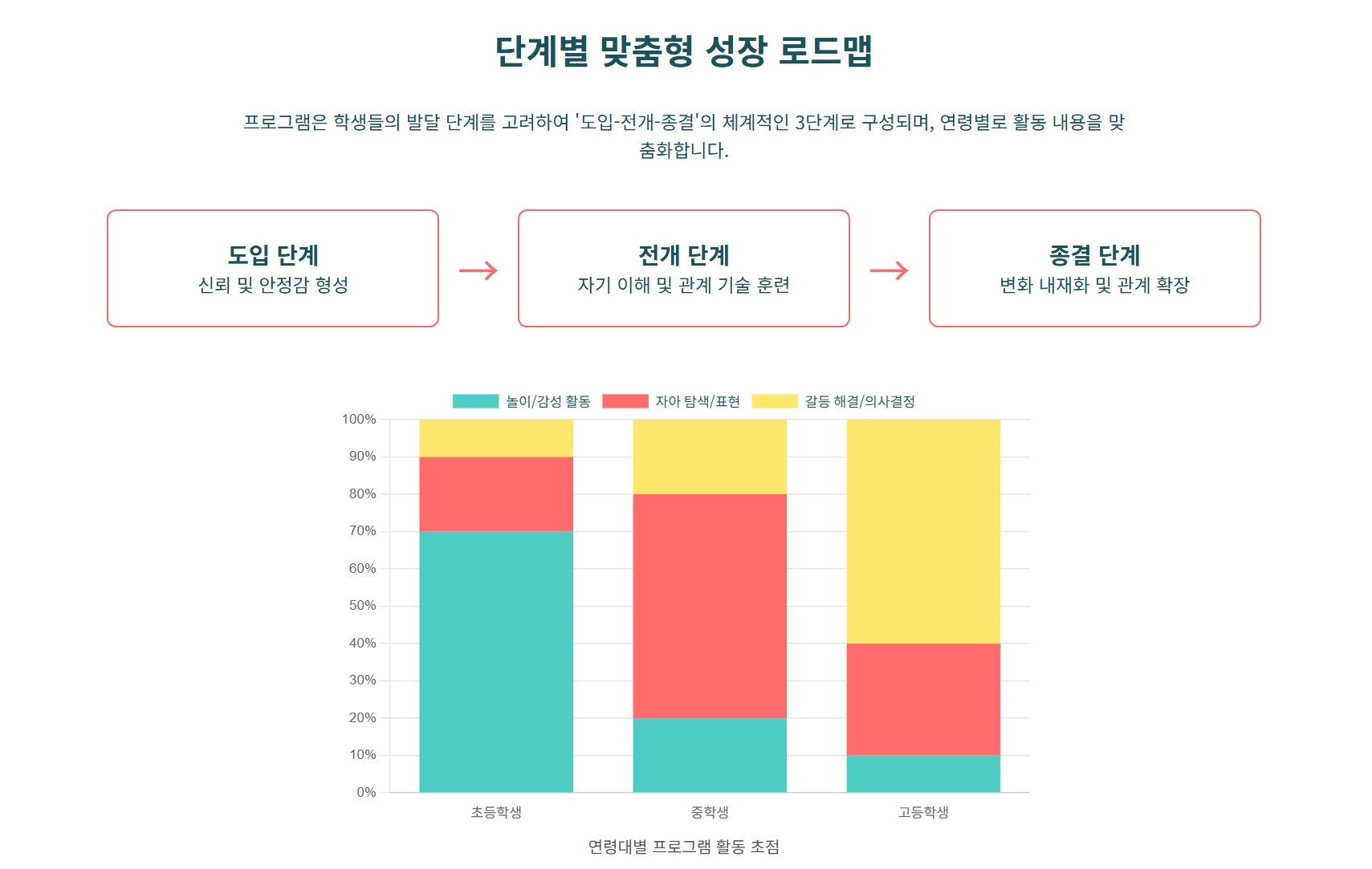 - 초등학생: 놀이와 감성 기반 활동을 중심으로 구성합니다. 저학년의 경우, 읽기 이해도 문제를 고려하여 또래 협동을 독려하는 활동이 효과적입니다. 고학년은 또래 관계의 미묘한 갈등을 다룰 수 있는 감정 및 의사소통 훈련에 초점을 맞춥니다.