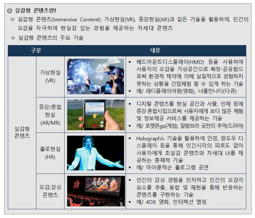 - 실감형 콘텐츠(Immersive Content): 가상현실(VR), 증강현실(AR)과 같은 기술을 활용하여, 인간의 오감을 자극하여 현실감 있는 경험을 제공하는 차세대 콘텐츠