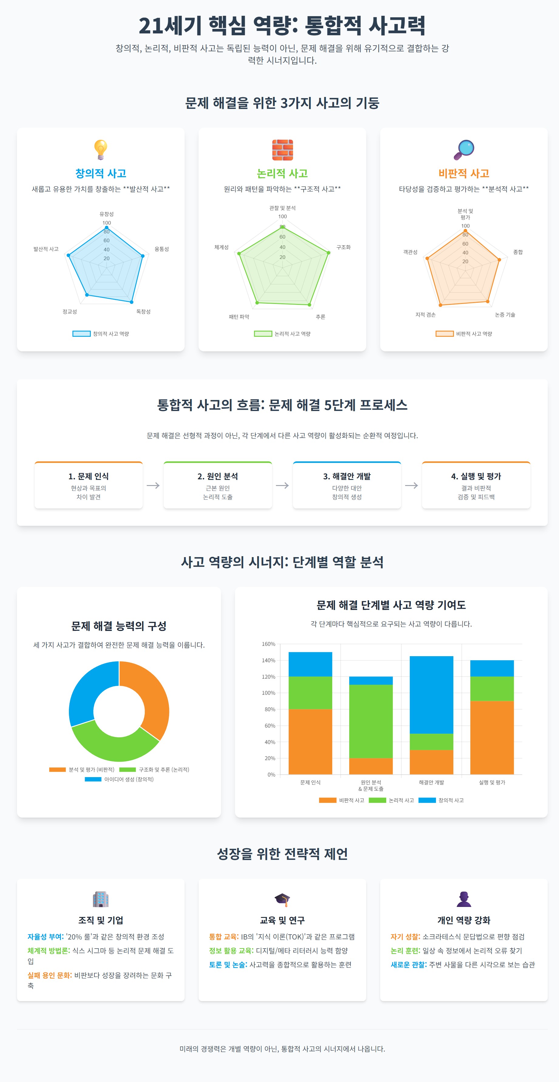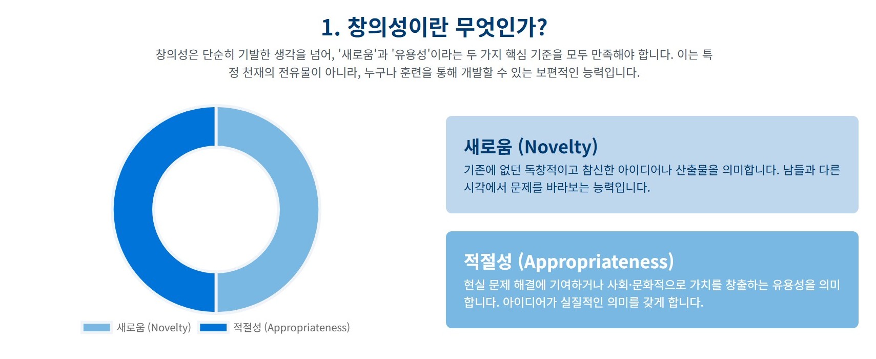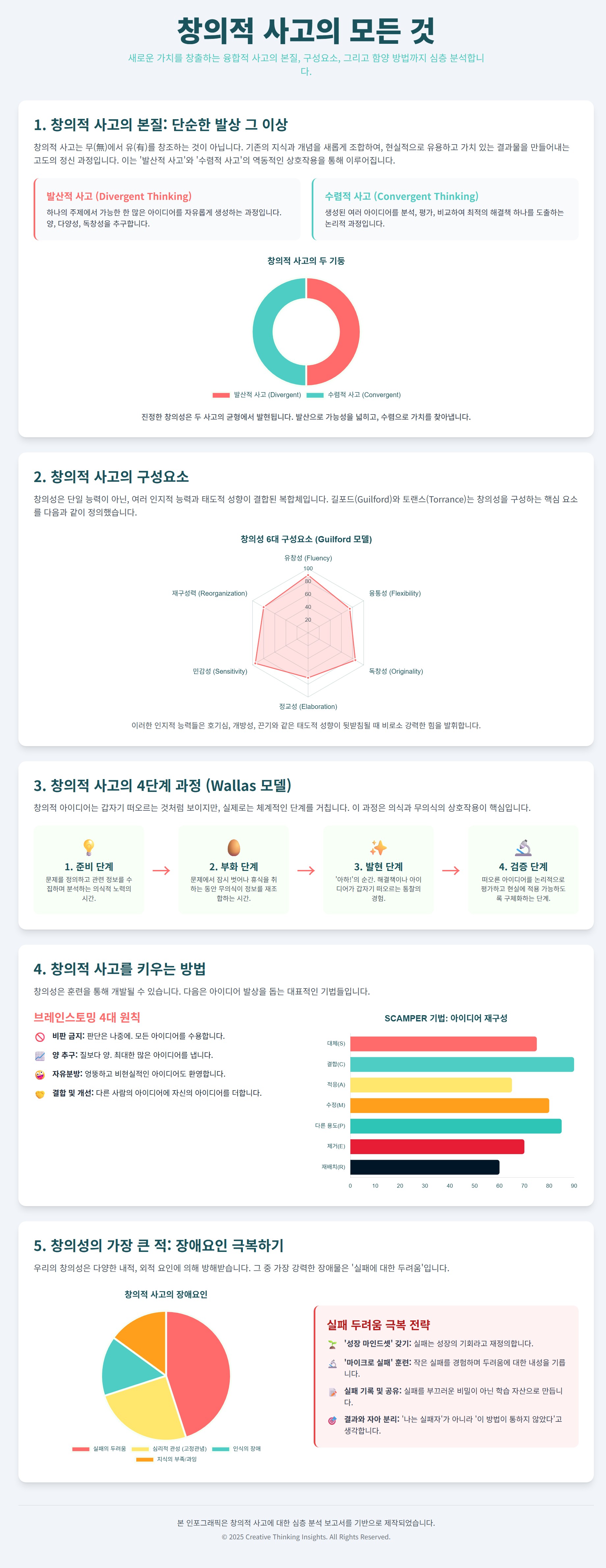 창의적 사고의 본질과 함양 방안: 심층 분석 및 실천 가이드 서론: 창의성의 시대, 재정의되는 창의적 사고의 중요성21세기는 단순한 지식의 양적 축적을 넘어, 복잡하고 예측 불가능한 문제에 대한 새롭고 유용한 해결책을 창출하는 능력을 요구하고 있다. 특히 4차 산업혁명 시대로의 전환은 이러한 요구를 더욱 가속화하며, 창의적 사고가 특정 분야의 천재나 예술가에게만 국한된 특수 능력이 아니라 모든 개인이 갖추어야 할 필수적인 역량으로 부상했음을 의미한다. 이러한 시대적 흐름 속에서 창의적 사고의 본질을 깊이 이해하고, 이를 실질적으로 함양하는 방법에 대한 체계적인 접근이 절실하다. 본 보고서는 창의적 사고에 대한 개념적 정의부터 심리학적 기제, 구성요소, 그리고 실질적인 함양 방안에 이르기까지 다층..