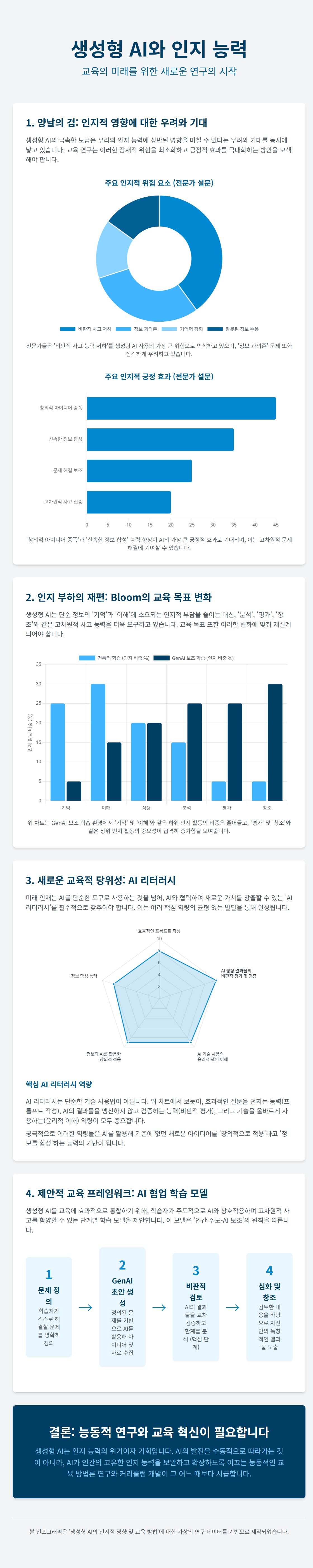 생성형 AI 사용이 인지 능력에 미치는 영향 분석 및 미래 교육 방법 I. 서론: 생성형 AI 시대의 인지 혁명과 교육적 도전1.1. 생성형 AI 기술 패러다임 변화의 정의 및 영향력생성형 인공지능(Generative AI, GenAI)은 기존 데이터를 학습하여 텍스트, 오디오, 이미지 등 새로운 콘텐츠를 창작할 수 있는 시스템으로 정의된다.1 이러한 기술은 인간의 작업과 유사한 방식으로 문맥과 의미를 이해하고 새로운 데이터를 생성해내며, 이는 지식 노동의 영역에서 전례 없는 생산성 향상을 야기하고 있다.2 복잡한 보고서 초안이나 전문가 수준의 프레젠테이션 디자인이 단시간 내에 완성되는 시대가 도래하면서, 생성형 AI는 우리의 삶과 업무 방식뿐만 아니라 근본적으로 사고하는 방식까지 변화시킬 잠재..